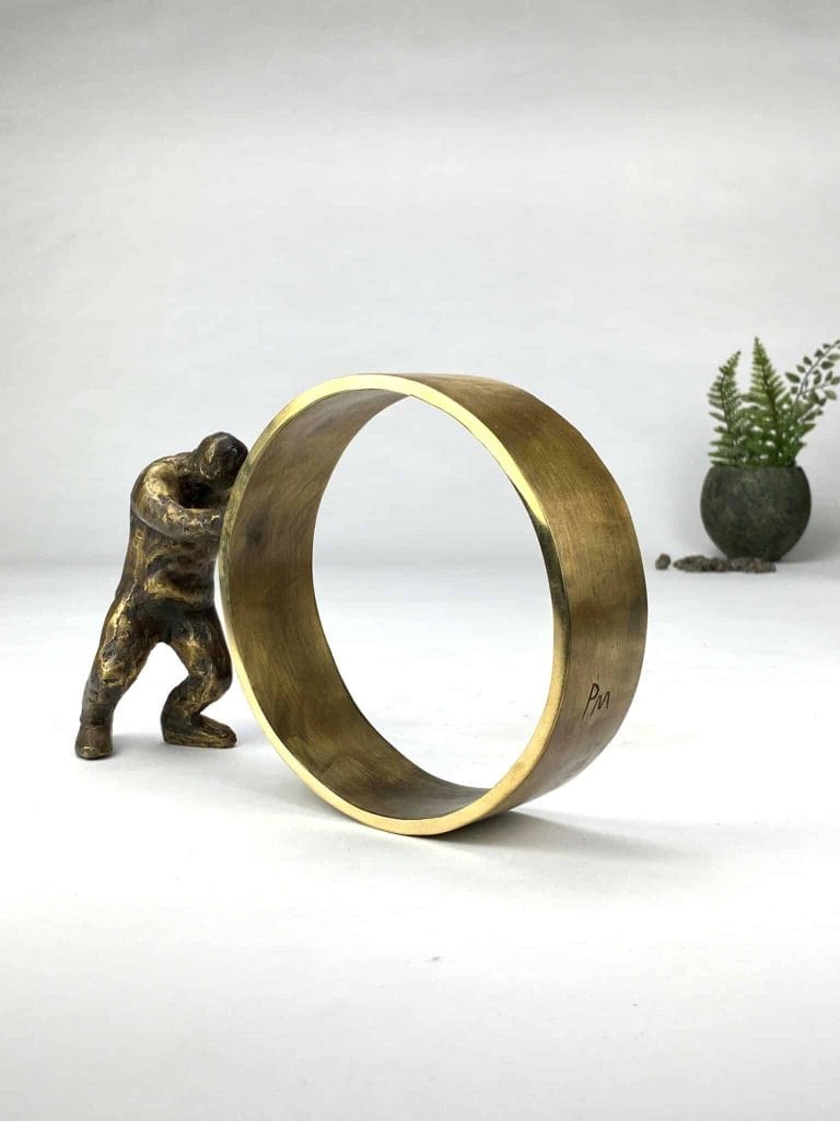De højpolerede sider på hjulet, spiller smukt sammen med skulpturens øvrige mørkere nuancer.