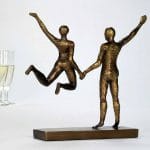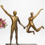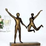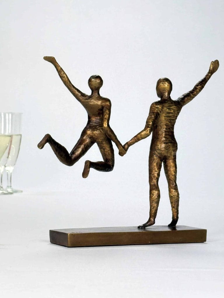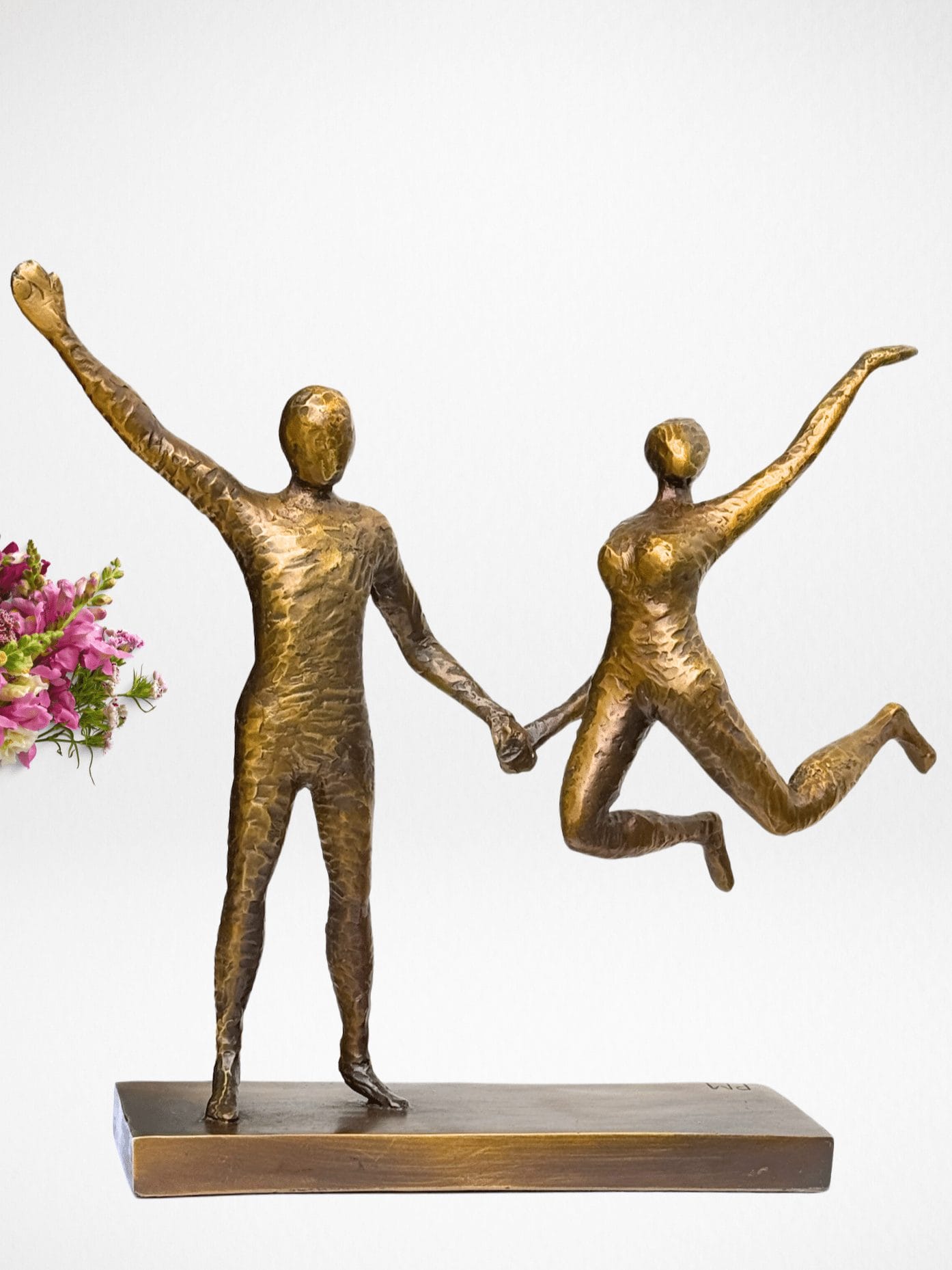 Skulpturen fanger et øjeblik af ren livsglæde – to mennesker i bevægelse, lette og frie, forbundet af et usynligt bånd.