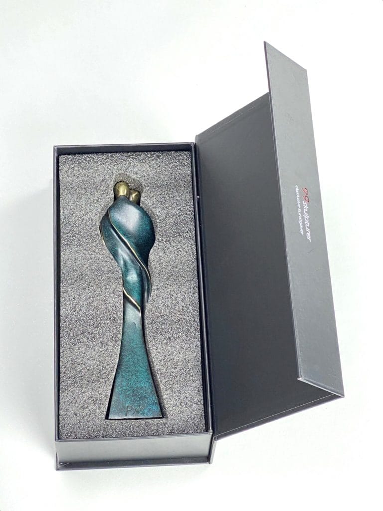 Skulpturen leveres i en flot gaveæske med vedlagt beskrivelse af kunstner samt kunstværk.