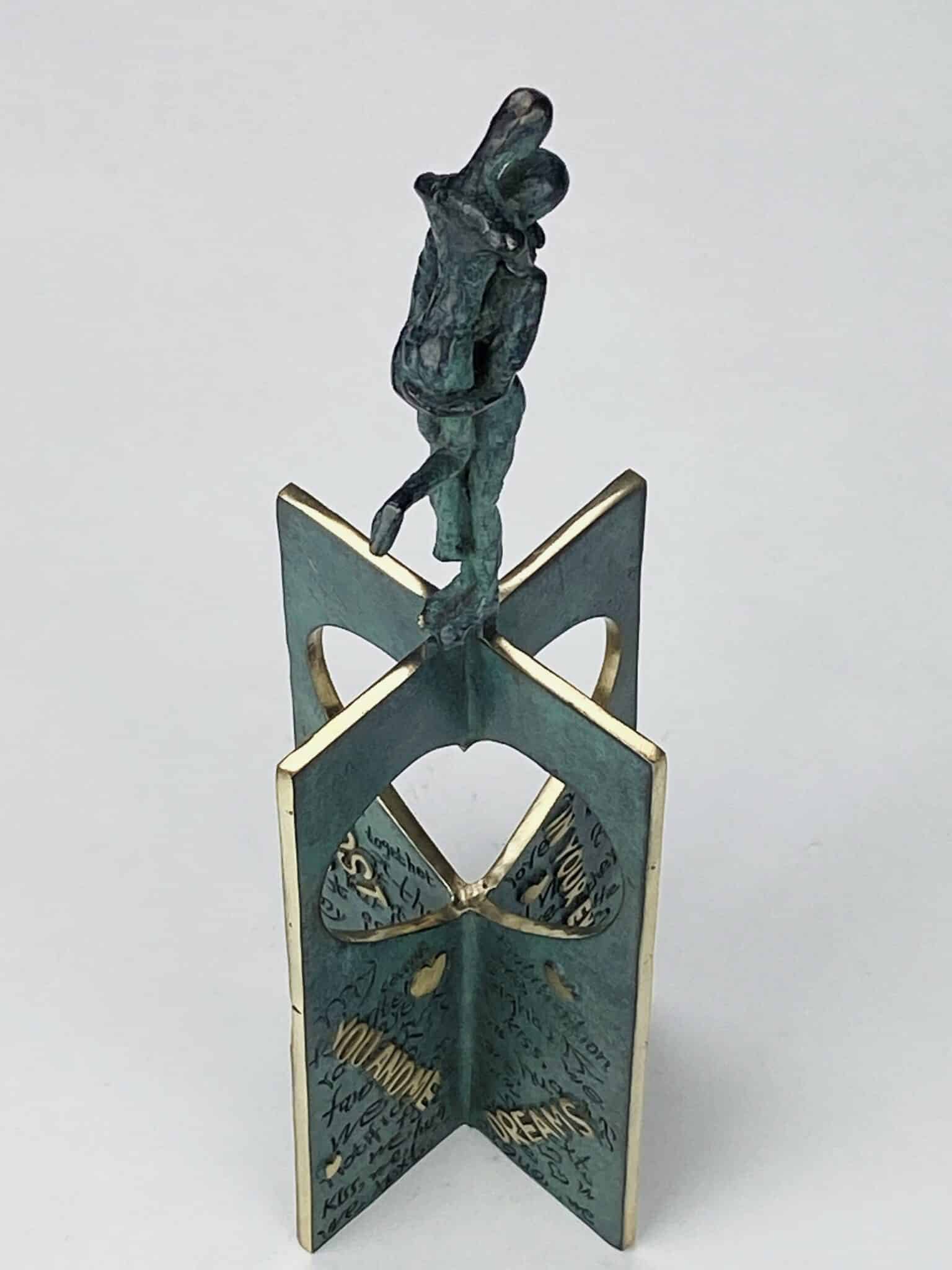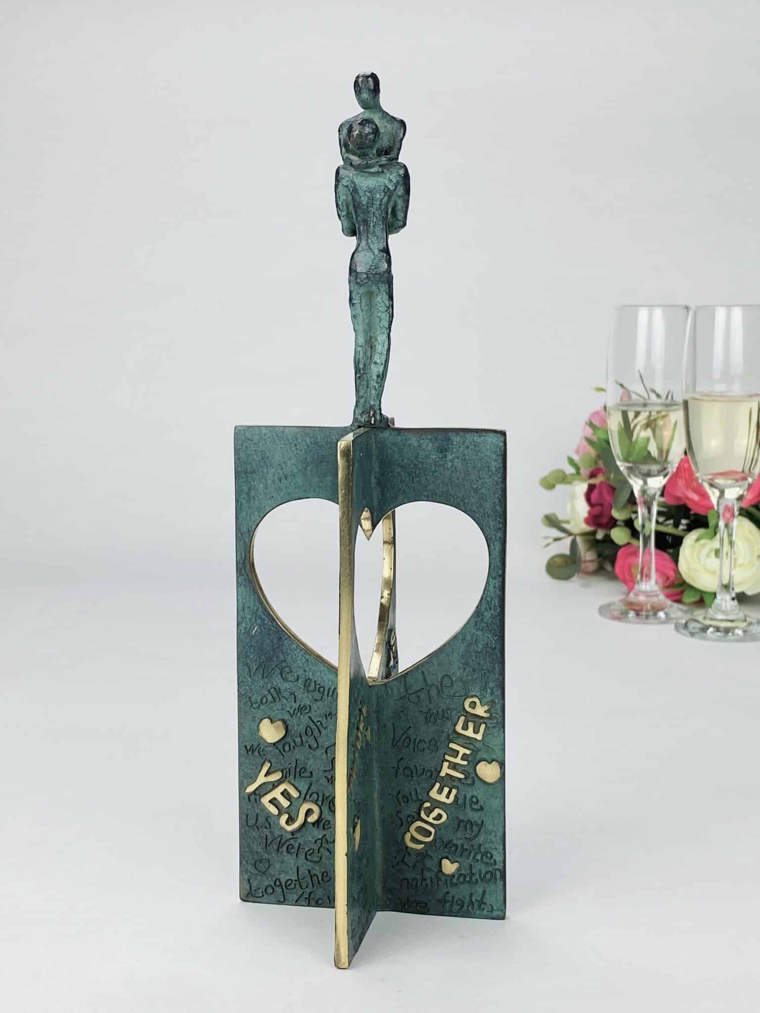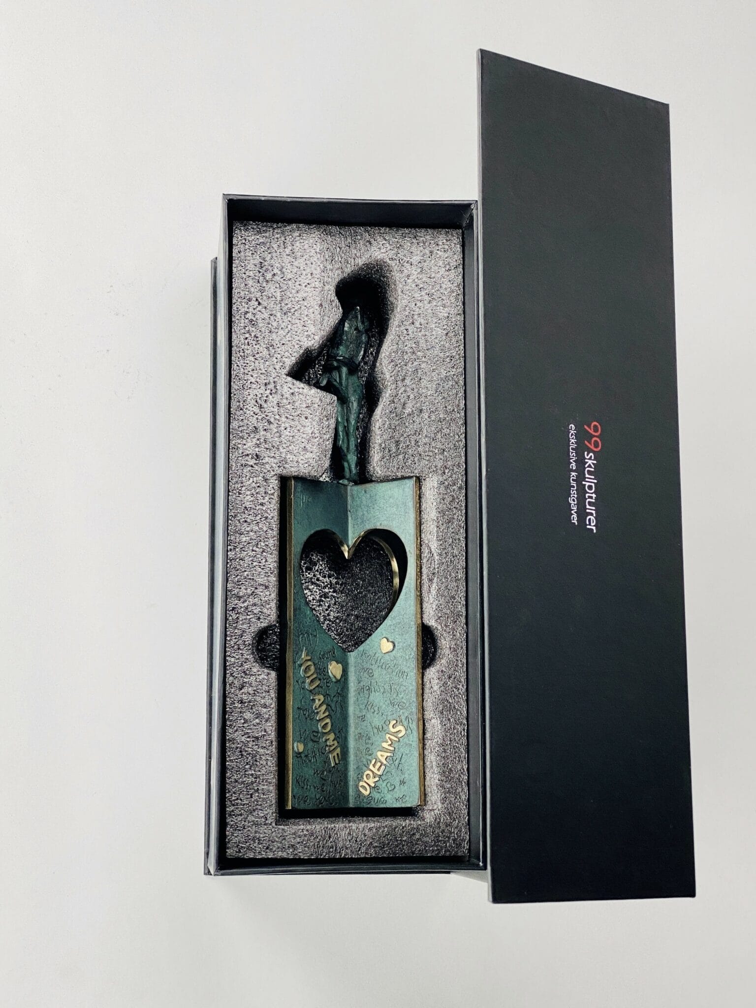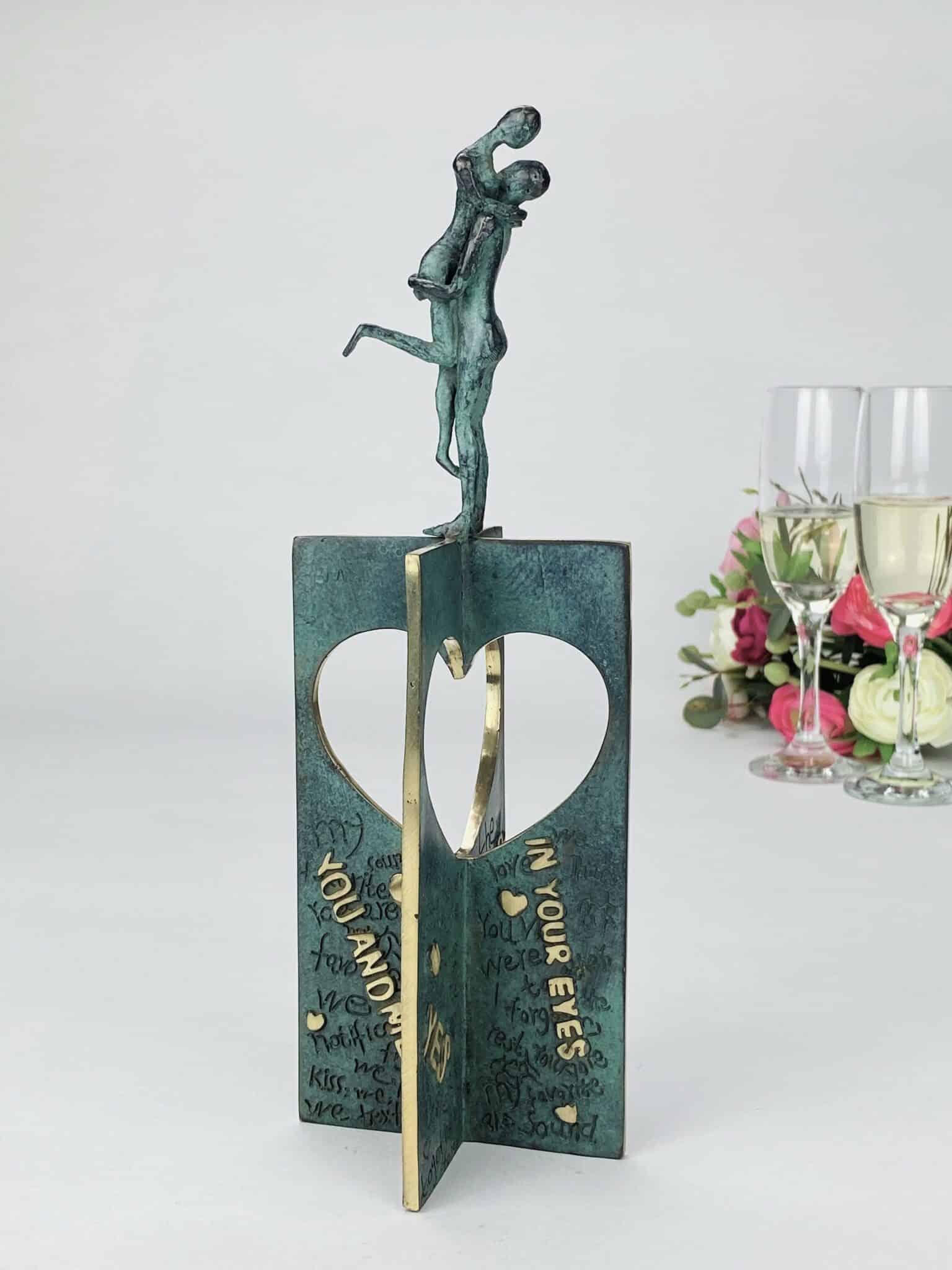 Skulpturens grønligt patinerede overflade brydes smukt af polerede tekststykker og detaljer i skinnende bronze – hvor det rå og det raffinerede smelter sammen, som kærlighedens egne kontraster.