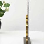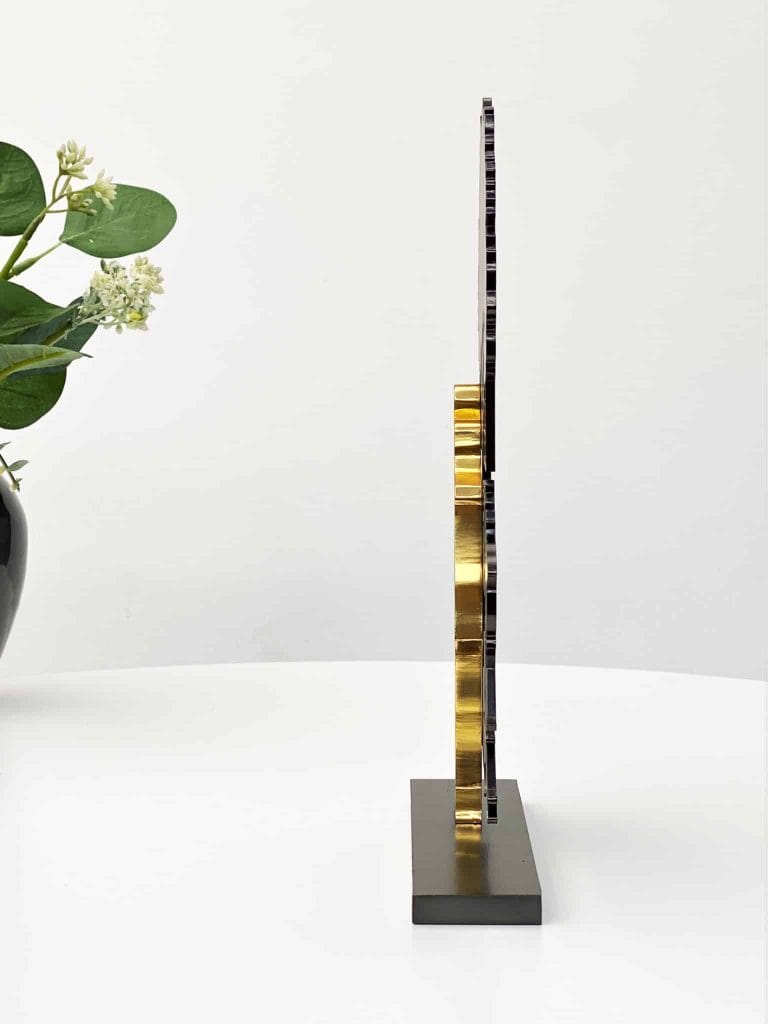 Skulpturen er fremstillet i premiumstål og fremstår i dybbrune (næsten sorte) og gyldne nuancer.