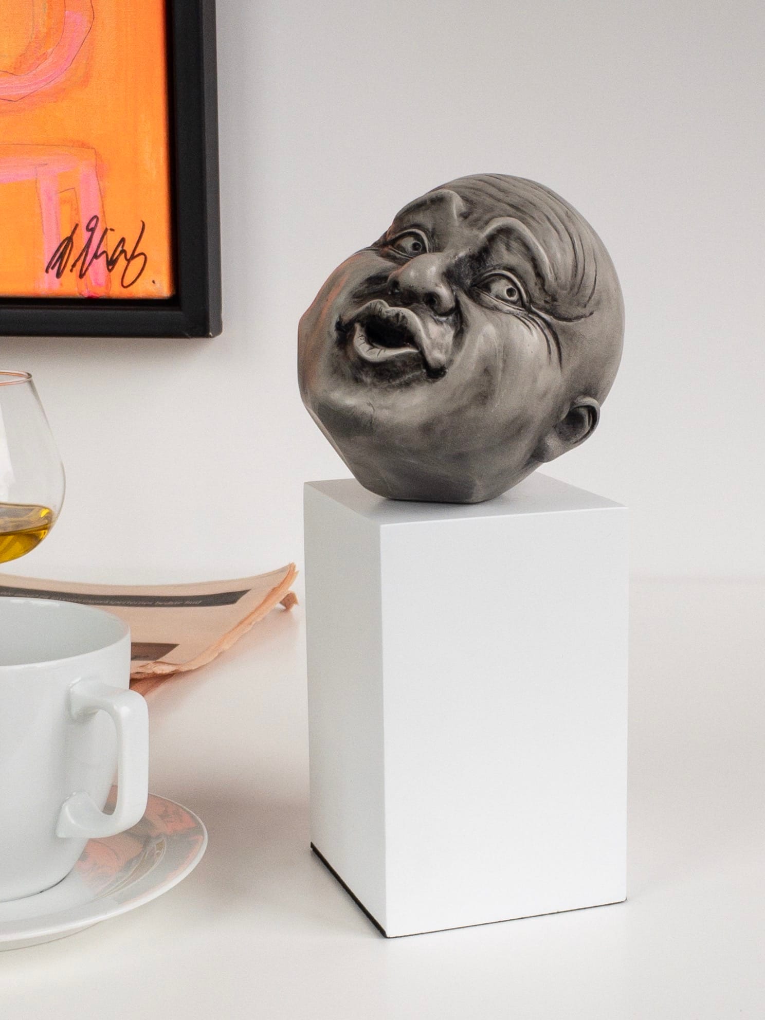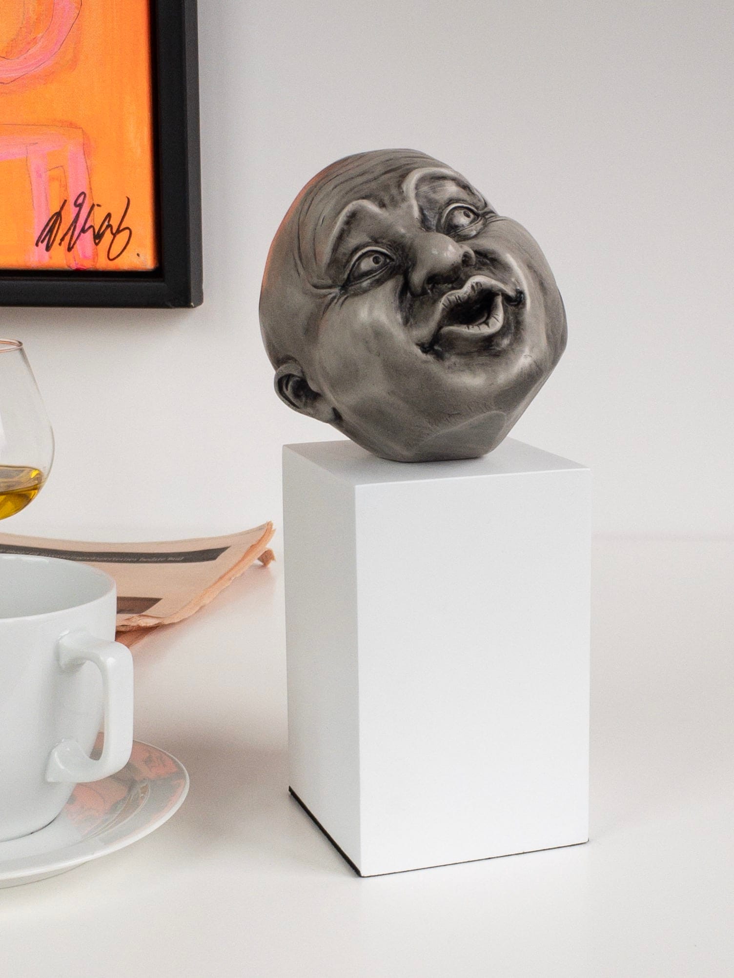Hvert hoved er unikt håndmalet og bevidst navnløst, så beskueren selv kan tolke, hvad der gemmer sig bag ansigtstrækkene. Placer dem enkeltvis – eller lad flere hoveder “tale sammen” og skabe sjove, underfundige situationer i hjemmet eller på kontoret.